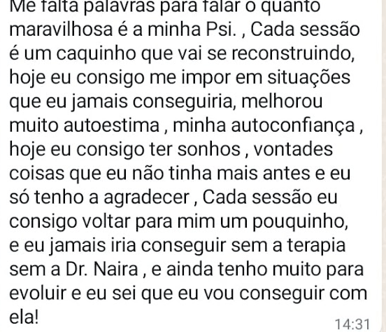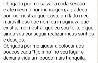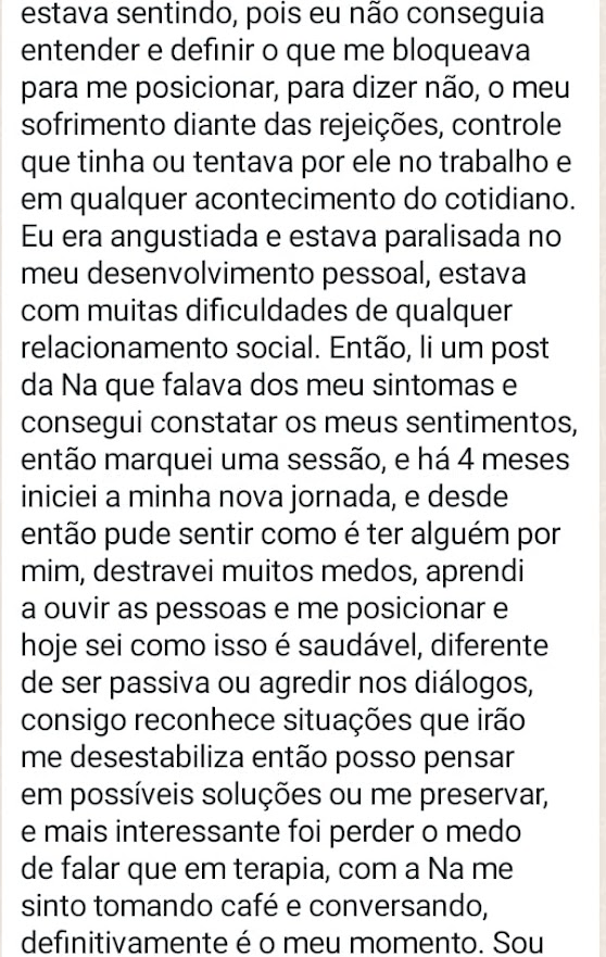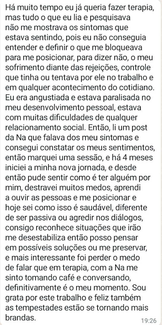 Tenho planos mensais e trimestrais que se adaptam à sua realidade e ao seu processo. O atendimento é particular, mas emito NF para que você solicite reembolso no plano de saúde.