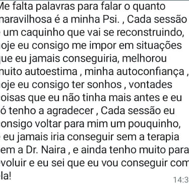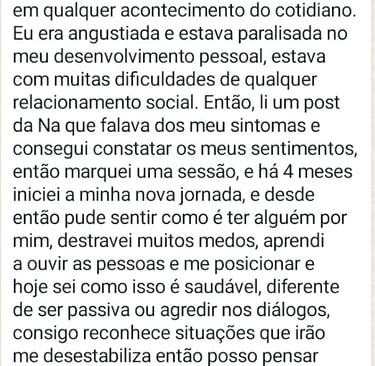 Especialista em saúde mental feminina, atendo principalmente mulheres adultas que vivem relações difíceis, dependência emocional e sobrecarga mental — mas também acolho adolescentes, jovens que enfrentam desafios como ansiedade, depressão, baixa autoestima, término de relacionamento, autocrítica e dificuldade em se posicionar.